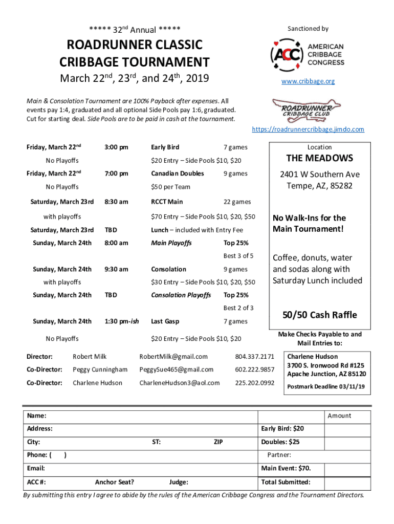 ***** 32nd Annual *****Sanctioned roadrunner CLASSIC CRIBBAGE TOURNAMENT March 22nd, 23rd, and 24th, 2019www.cribbage.remain & Consolation Tournament are 100% Payback after expenses. All events pay