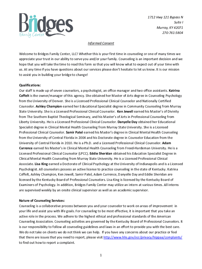 1712 Hwy 121 Bypass N Suite I Murray, KY 42071 2707615804 Informed Consent Welcome to Bridges Family Center, LLC! Whether this is your first time in counseling or one of many times we appreciate your