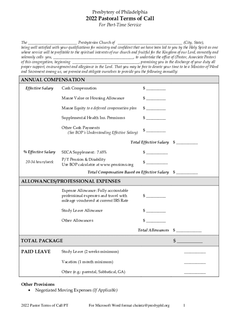 Presbytery of Philadelphia2022 Pastoral Terms of Call For Maritime Serviette ___ Presbyterian Church of ___ (City, State), being well satisfied with your qualifications for ministry and confident