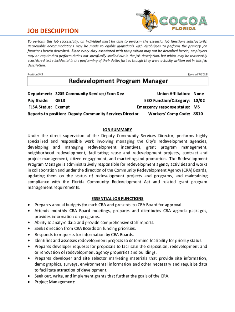 JOB DESCRIPTION To perform this job successfully, an individual must be able to perform the essential job functions satisfactorily. Reasonable accommodations may be made to enable individuals with