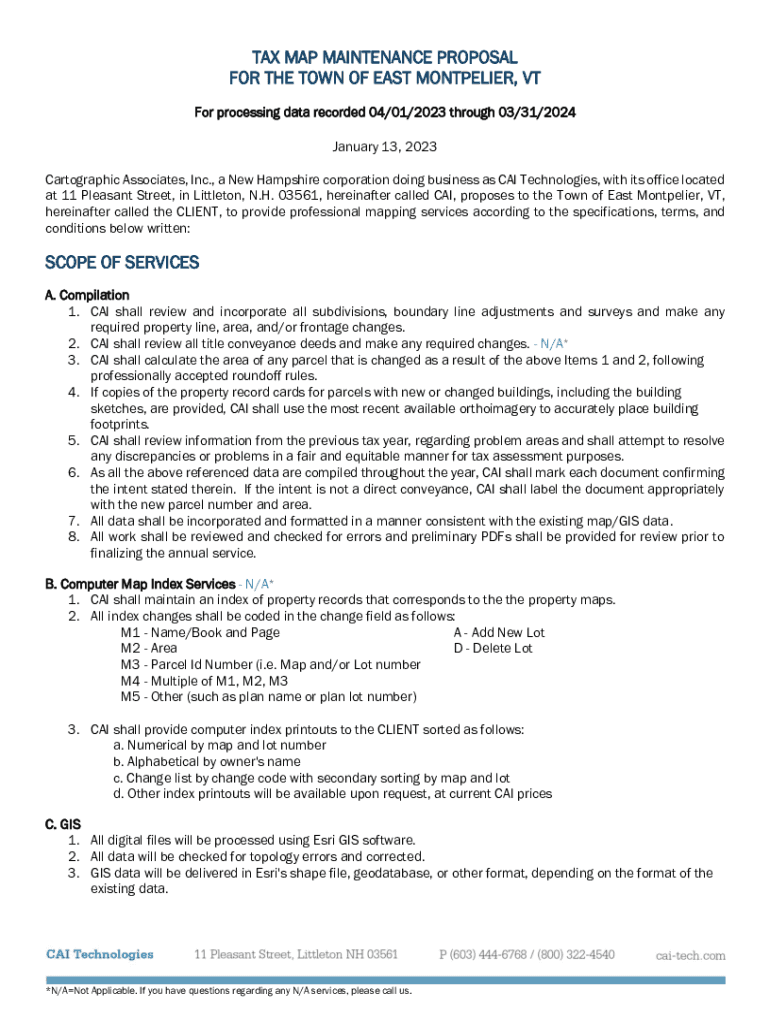 TAX MAP MAINTENANCE PROPOSAL FOR THE TOWN OF EAST MONTPELIER, VT For processing data recorded 04/01/2023 through 03/31/2024 January 13, 2023, Cartographic Associates, Inc., a New Hampshire corporation
