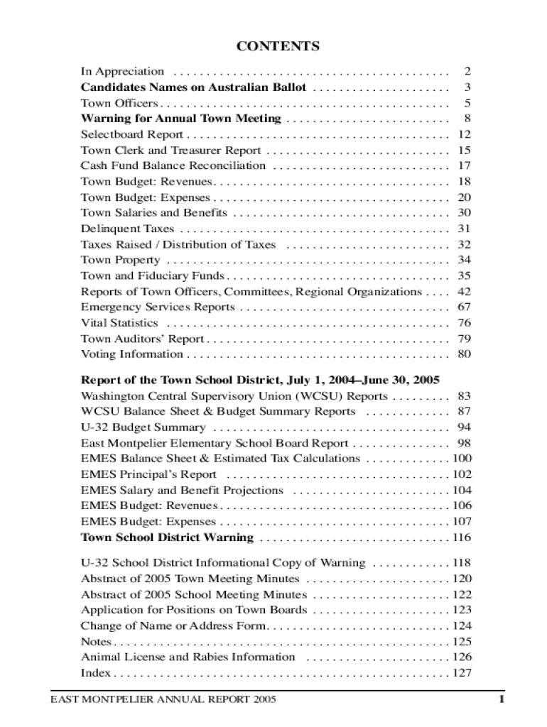 CONTENTS In Appreciation. . . . . . . . . . . . . . . . . . . . . . . . . . . . . . . . . . . . . . . . . . Candidate Names on Australian Ballot. . . . . . . . . . . . . . . . . . . . . Town Officers.