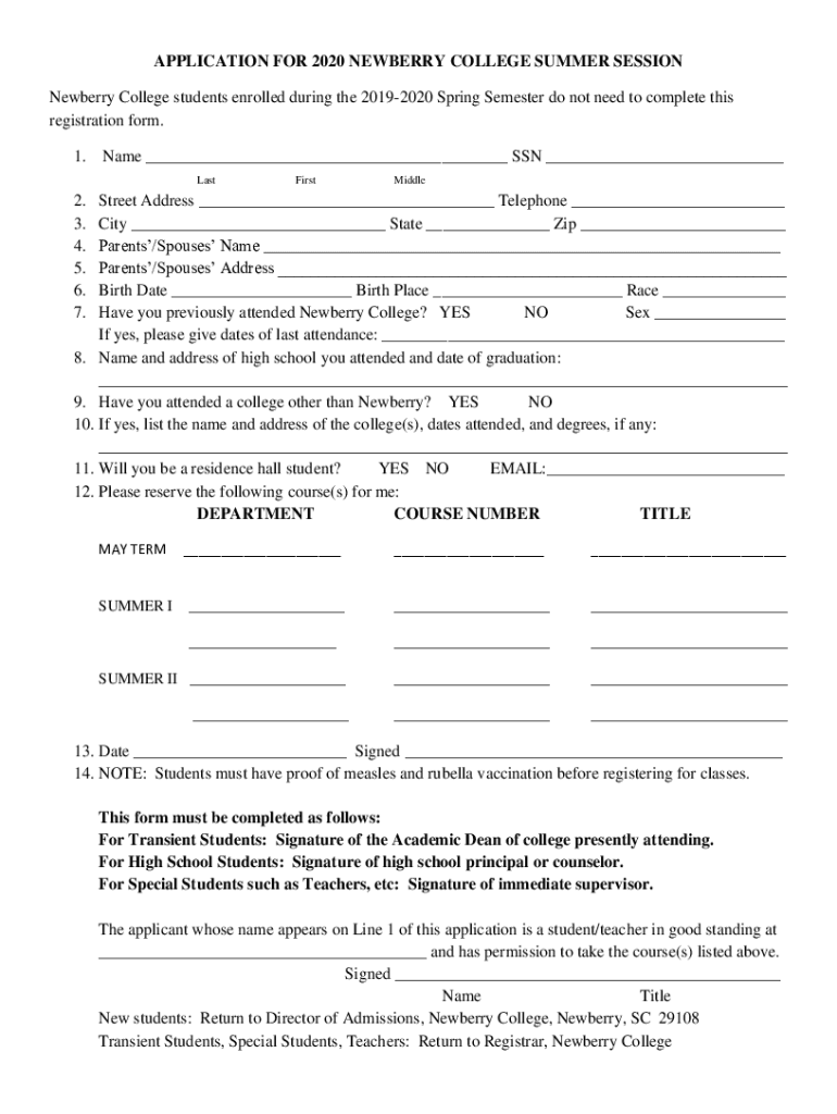 APPLICATION FOR 2020 NEWBERRY COLLEGE SUMMER SESSION Newberry College students enrolled during the 20192020 Spring Semester do not need to complete this registration form. 1. Name ___ SSN ___ LastFirstMiddle2.