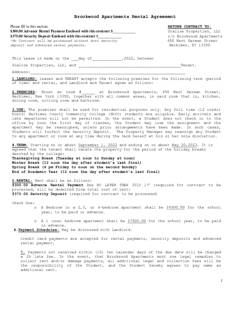 Brook wood Apartments Rental Agreement Please fill in this section: $300.00 Advance Rental Payment Enclosed with this contract $___ $375.00 Security Deposit Enclosed with this contract $___ *No Contract