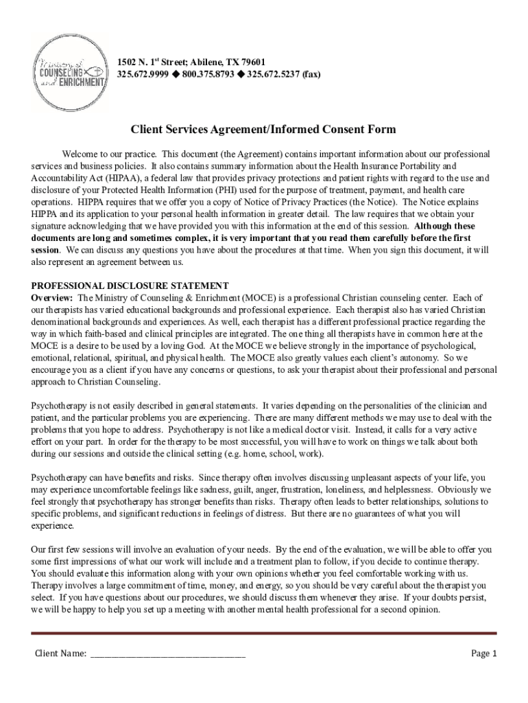 1502 N. 1st Street; Abilene, TX 79601 325.672.9999 800.375.8793 325.672.5237 (fax)Client Services Agreement/Informed Consent Form Welcome to our practice. This document (the Agreement) contains important