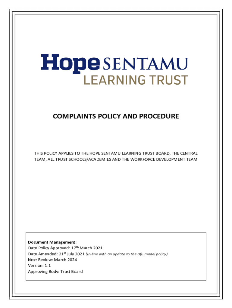 COMPLAINTS POLICY AND PROCEDURES POLICY APPLIES TO THE HOPE SENT AMU LEARNING TRUST BOARD, THE CENTRAL TEAM, ALL TRUST SCHOOLS/ACADEMIES AND THE WORKFORCE DEVELOPMENT TEAMDocument Management: Date