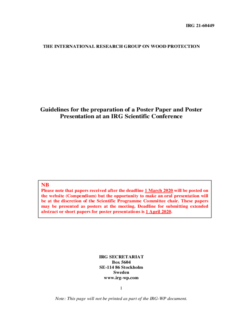 IRG 2160449THE INTERNATIONAL RESEARCH GROUP ON WOOD PROTECTIONGuidelines for the preparation of a Poster Paper and Poster Presentation at an IRG Scientific Conference NB Please note that papers received