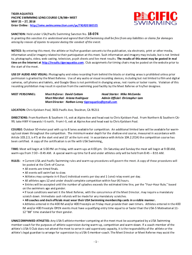 TIGER AQUATICS PACIFIC SWIMMING LONG COURSE C/B/BB+ MEET MAY 25 27, 2018 Enter Online: http://ome.swimconnection.com/pc/TIGR20180525 SANCTION: Held under the USA/Pacific Swimming Sanction No. 18074