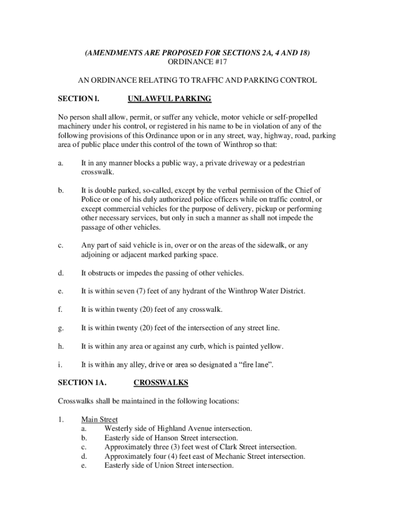 (AMENDMENTS ARE PROPOSED FOR SECTIONS 2A, 4 AND 18) ORDINANCE #17 AN ORDINANCE RELATING TO TRAFFIC AND PARKING CONTROL SECTION l.UNLAWFUL PARKING No person shall allow, permit, or suffer any vehicle,