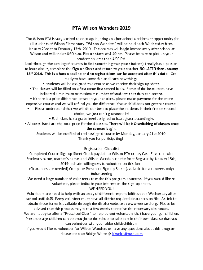 PTA Wilson Wonders 2019 The Wilson PTA is very excited to once again, bring an after school enrichment opportunity for all students of Wilson Elementary. Wilson Wonders will be held each Wednesday