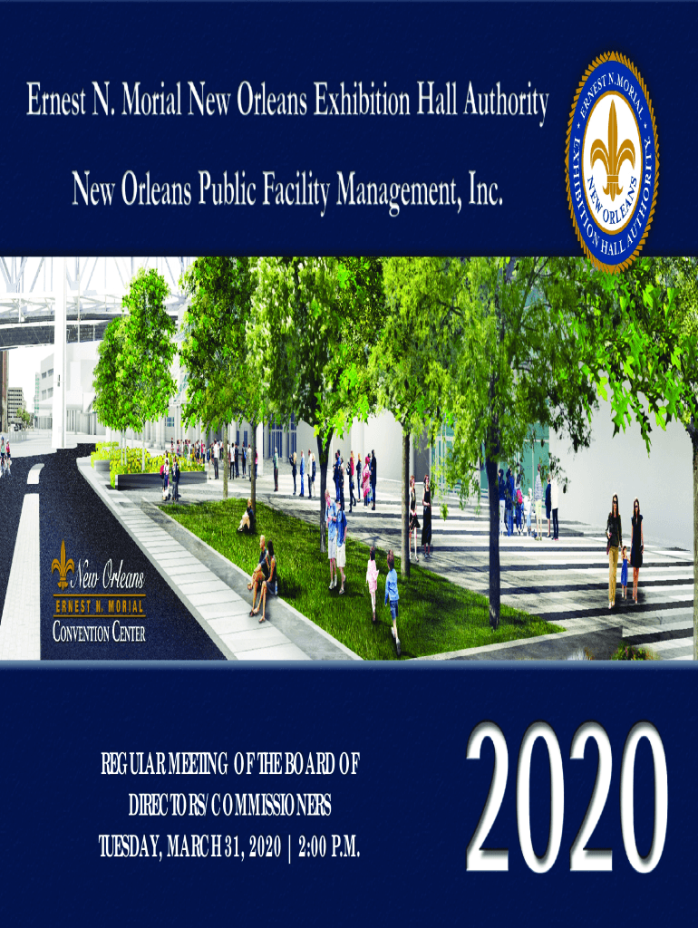 REGULAR MEETING OF THE BOARD OF DIRECTORS/COMMISSIONERS TUESDAY, MARCH 31, 2020 | 2:00 P.M.NOEMI AGENDARegular Meeting of the Board of Directors New Orleans Public Facility Management, Inc. (NOEMI)https://attendee.gotowebinar.com/register/9143134482217406988