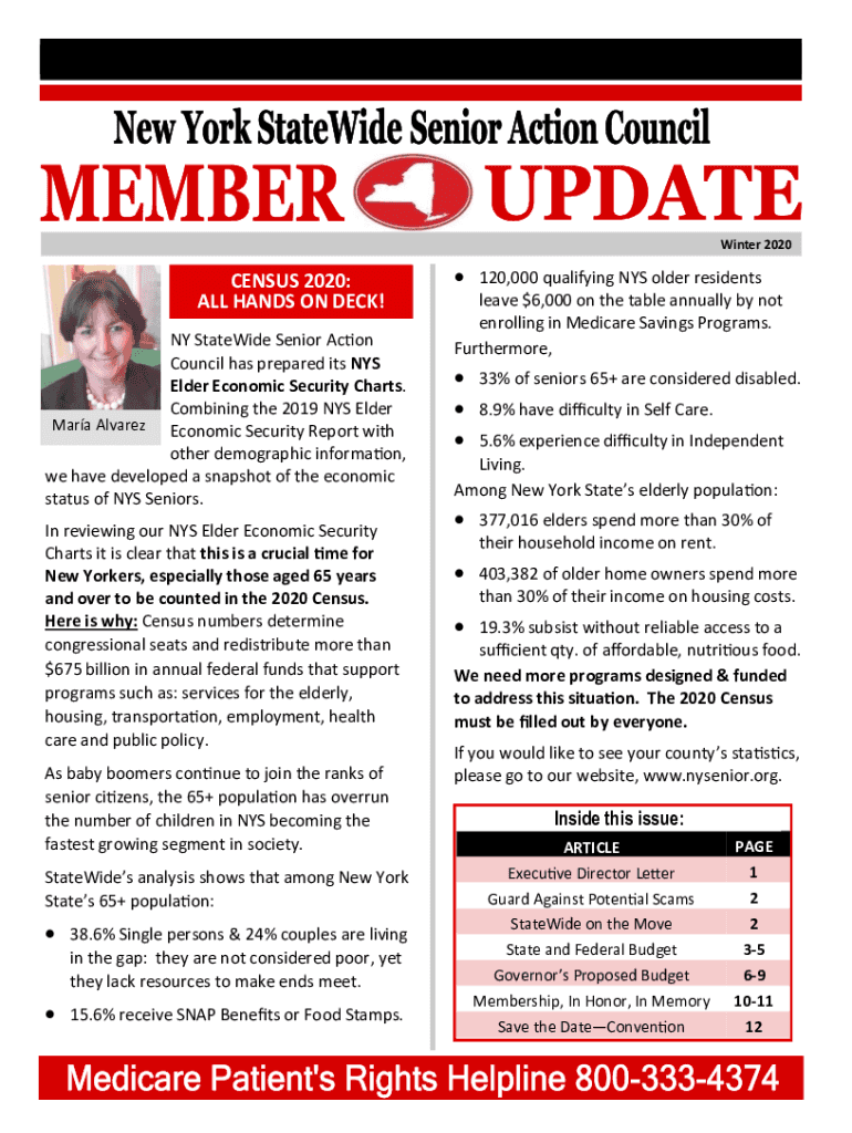 . Winter 2020CENSUS 2020: ALL HANDS ON DECK! NY Statewide Senior Action Council has prepared its NYS Elder Economic Security Charts. Combining the 2019 NYS Elder Mara Alvarez Economic Security Report