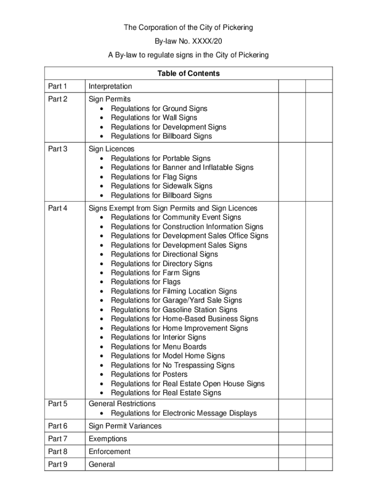 The Corporation of the City of Pickering Bylaw No. XXX/20 A Bylaw to regulate signs in the City of Pickering Table of Contents Part 1InterpretationPart 2Sign Permits Regulations for Ground Signs Regulations