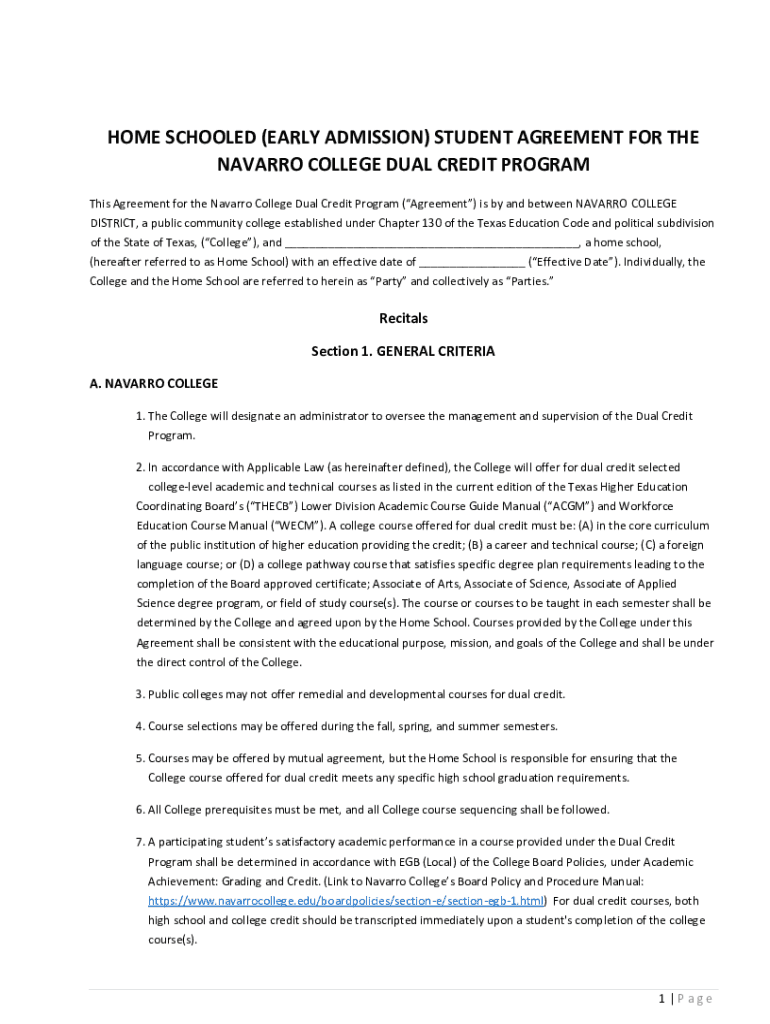 HOME SCHOOLED (EARLY ADMISSION) STUDENT AGREEMENT FOR THE NAVARRO COLLEGE DUAL CREDIT PROGRAM This Agreement for the Navarro College Dual Credit Program (Agreement) is by and between NAVARRO COLLEGE