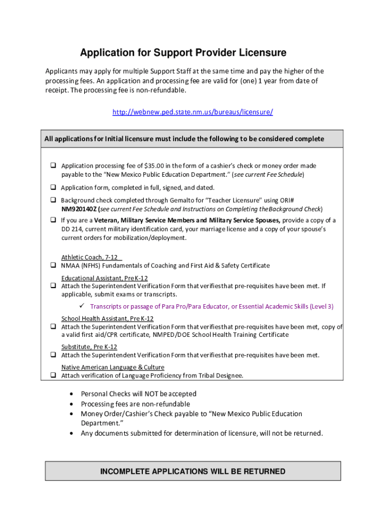 Application for Support Provider Licensure Applicants may apply for multiple Support Staff at the same time and pay the highest of the processing fees. An application and processing fee are valid