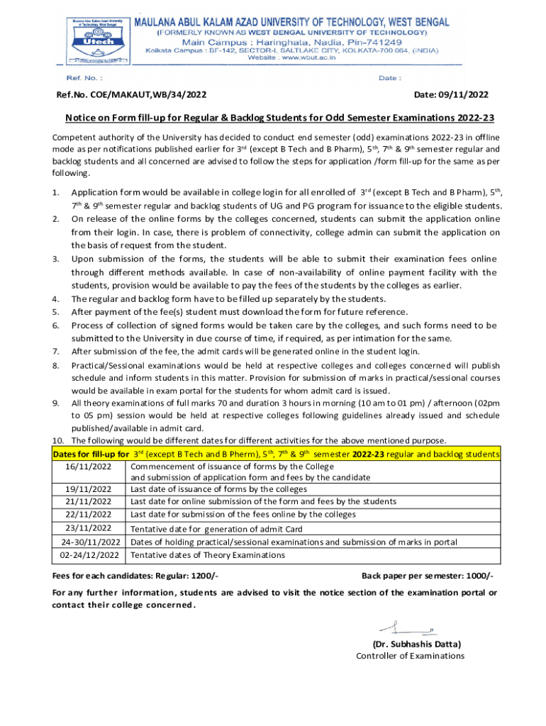 Ref.No. COE/MAK AUT, WB/34/2022Date: 09/11/2022Notice on Form fillip for Regular & Backlog Students for Odd Semester Examinations 202223 Competent authority of the University has decided to conduct