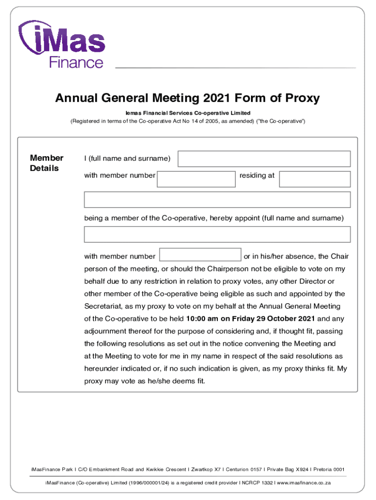 Annual General Meeting 2021 Form of Proxy Teams Financial Services Cooperative Limited(Registered in terms of the Cooperative Act No 14 of 2005, as amended) (the Cooperative)Member Details (full name
