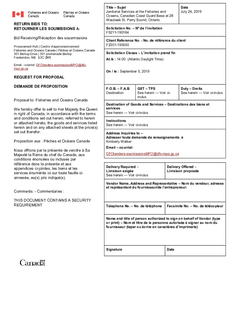 RETURN BIDS TO: RETURNER LES COMMISSIONS : Bid Receiving/Reception DES sous missions Procurement Hub | Center dapprovisionnement Fisheries and Oceans Canada | Ache set Cans Canada 301 Bishop Drive