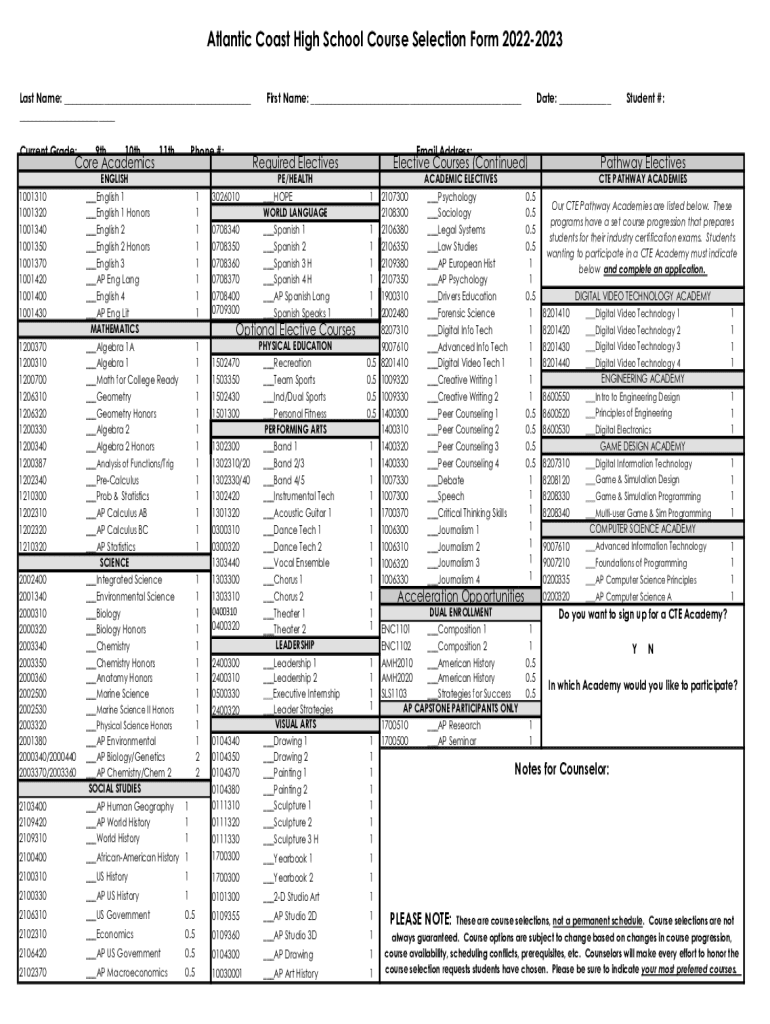 Atlantic Coast High School Course Selection Form 20222023 Last Name: ___ ___ Current Grade:9th10thCore Academics11thPhone #:First Name: ___ Email Address:Required ElectivesElective Courses (Continued)2103400