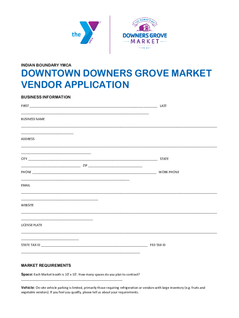 INDIAN BOUNDARY YMCADOWNTOWN DOWNERS GROVE MARKET VENDOR APPLICATION BUSINESS INFORMATION FIRST ___ LAST ___ BUSINESS NAME ___ ___ ADDRESS ___ ___ CITY ___ STATE ___ ZIP ___ PHONE ___ WORK PHONE ___