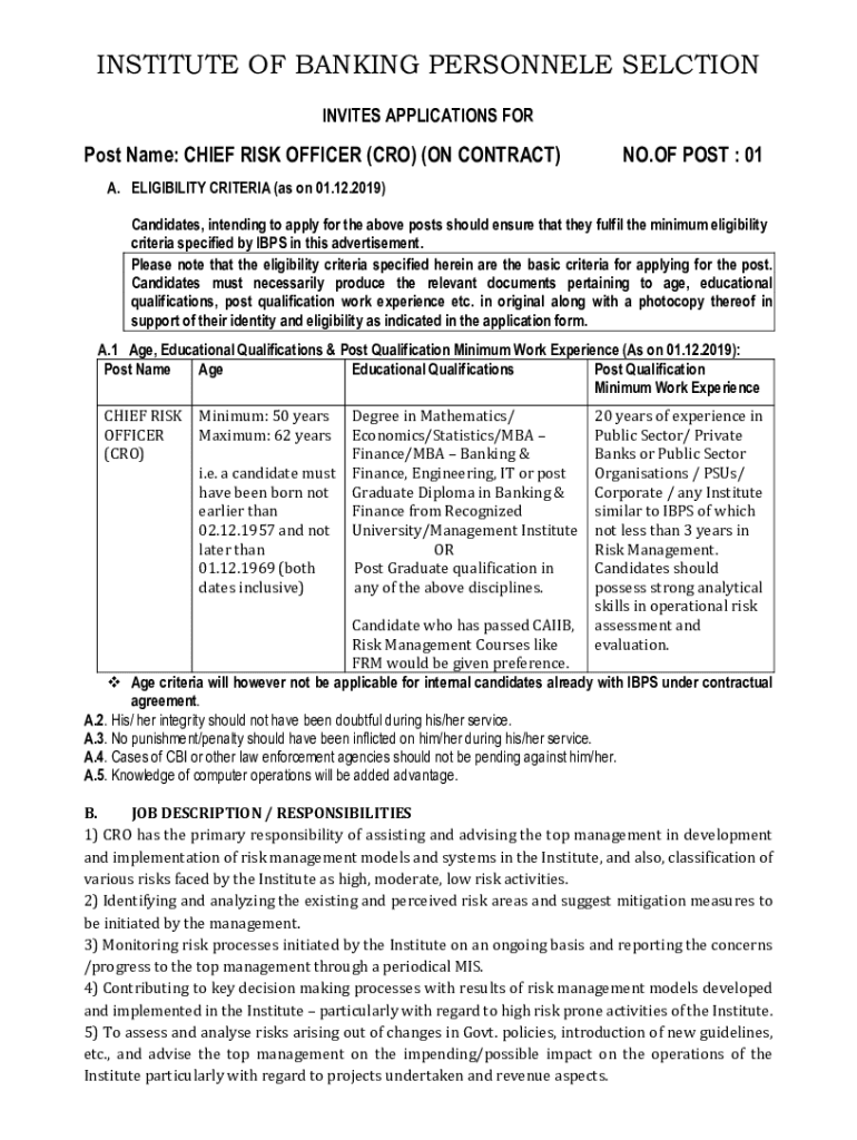 INSTITUTE OF BANKING PERSONNEL SECTION INVITES APPLICATIONS FOR Post Name: CHIEF RISK OFFICER (CRO) (ON CONTRACT)NO.OF POST : 01A. ELIGIBILITY CRITERIA (as on 01.12.2019) Candidates, intending to