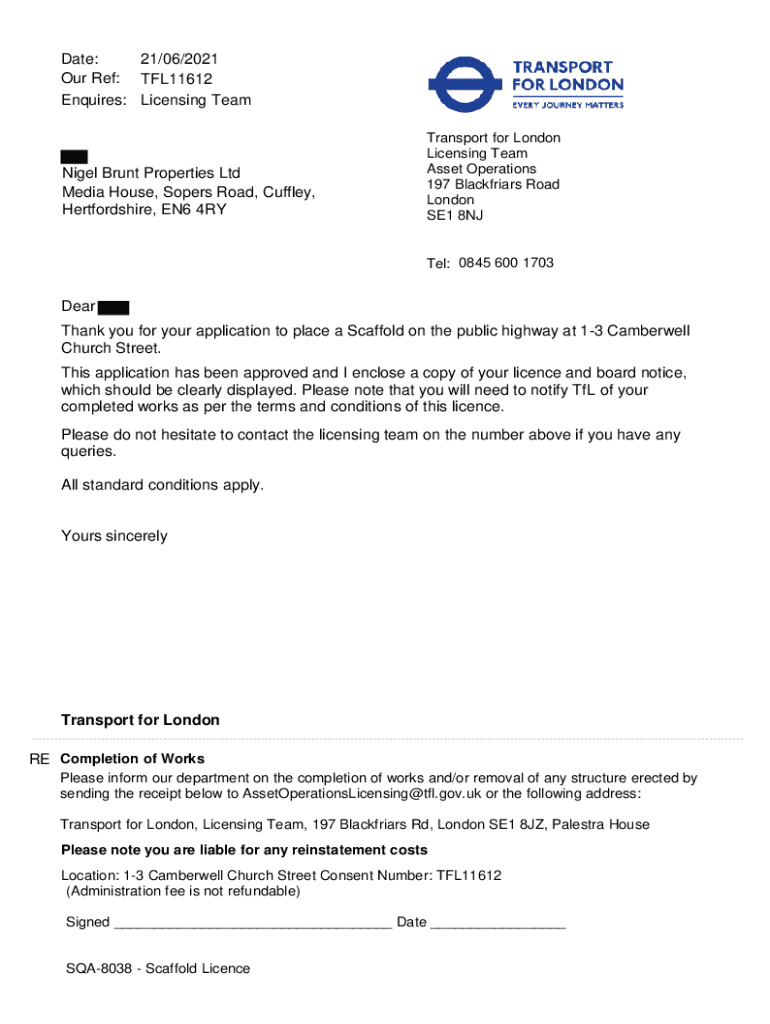 Date: 21/06/2021 Our Ref: TFL11612 Inquires: Licensing Team Nigel Brunt Properties Ltd Media House, Supers Road, Roughly, Hertfordshire, EN6 4RYTransport for London Licensing Team Asset Operations