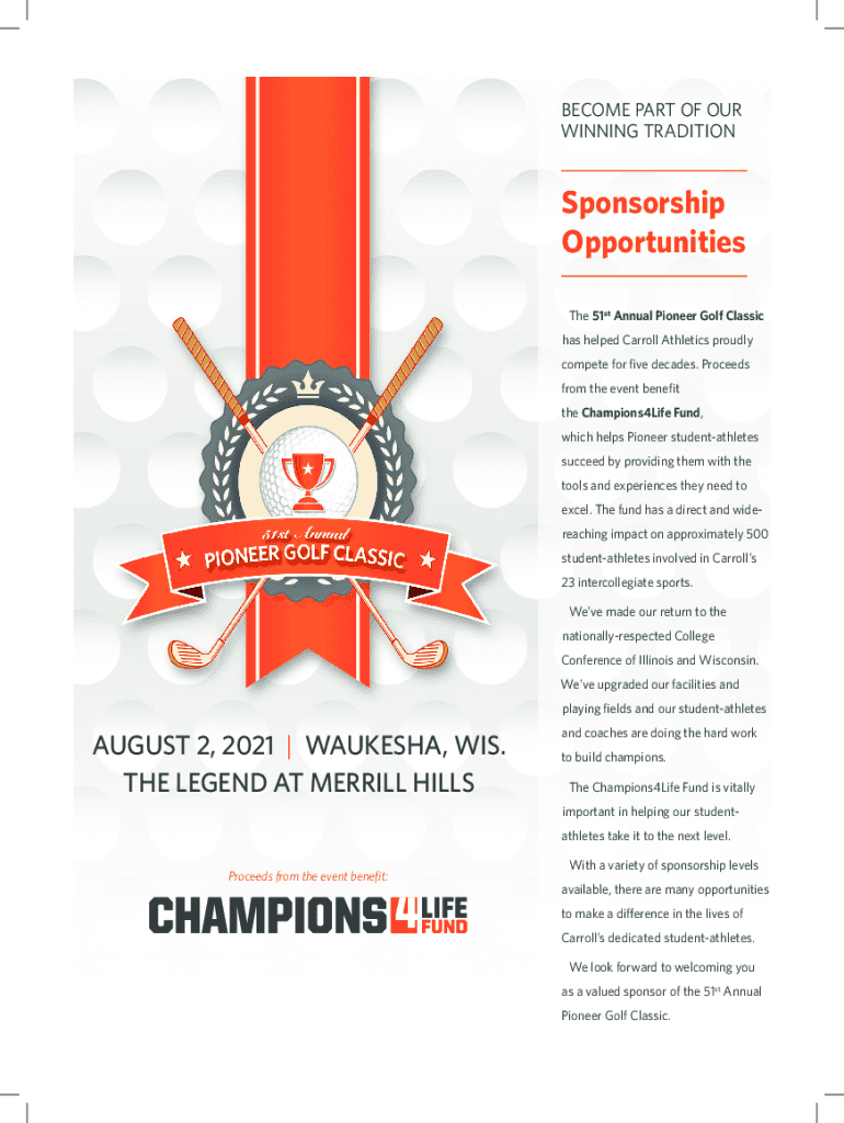 BECOME PART OF OUR WINNING TRADITIONSponsorship Opportunities 51st Annual Pioneer Golf Classic has helped Carroll Athletics proudly compete for five decades. Proceeds from the event benefit the Champions4Life