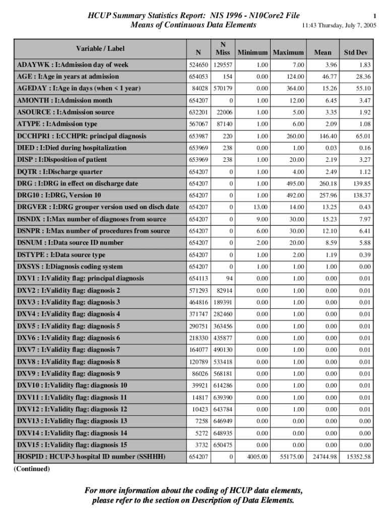 CUP Summary Statistics Report: IS 1996 N10Core2 File 1 Means of Continuous Data Elements 11:43 Thursday, July 7, 2005, Variable / Label MissMinimum MaximumMeanStd DevADAYWK : I:Admission day of week524650