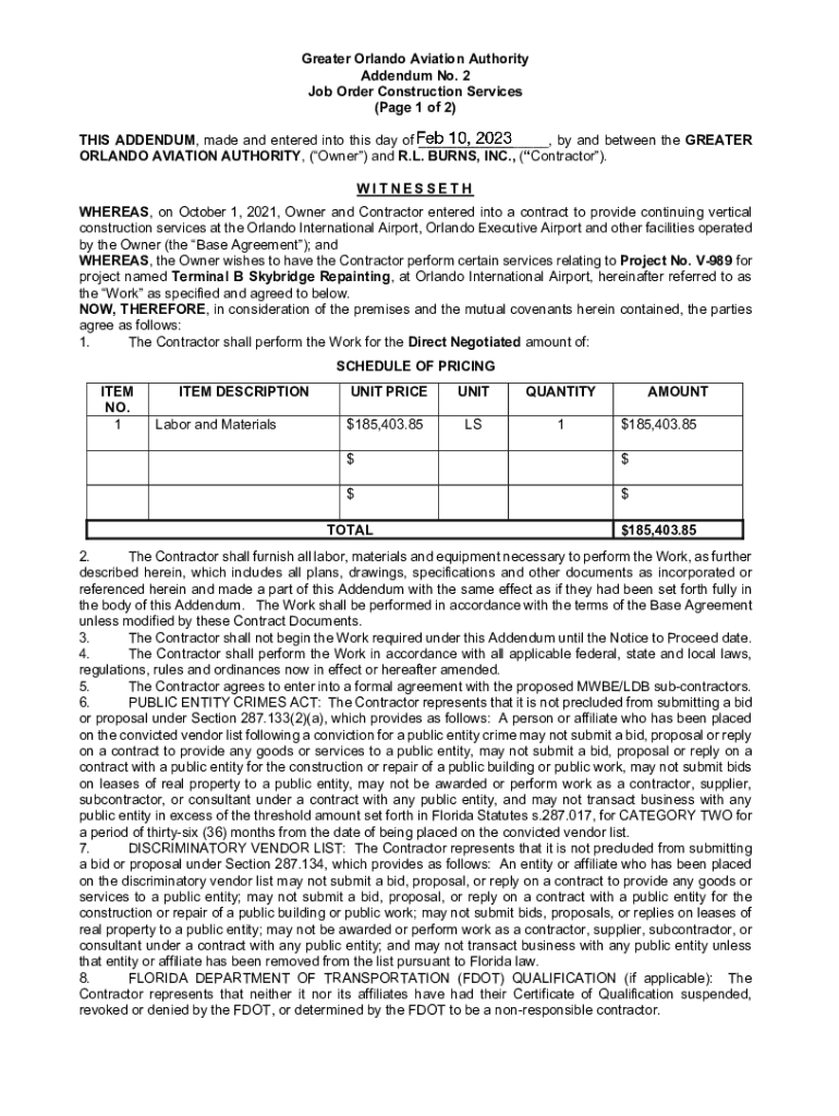 Greater Orlando Aviation Authority Addendum No. 2 Job Order Construction Services (Page 1 of 2) ___ THIS ADDENDUM, made and entered into this day of ___ ___, by and between the GREATER ORLANDO AVIATION