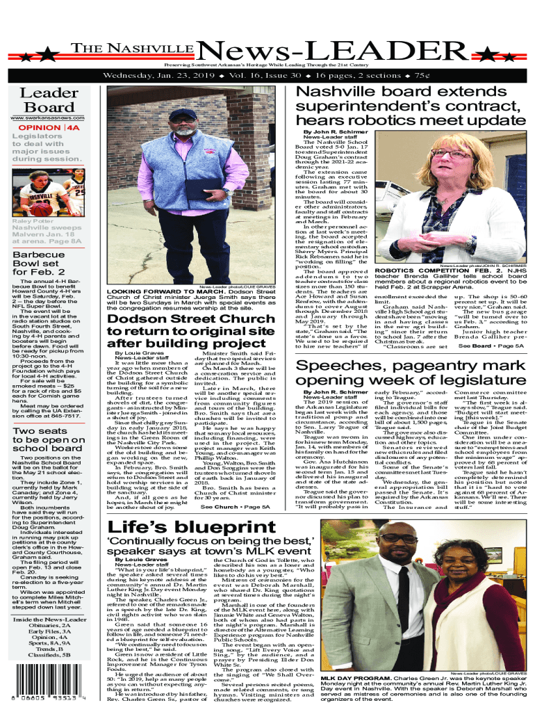 THE NASHVILLELeader BoardNewsLEADER Preserving Southwest Arkansas's Heritage While Leading Through the 21st Century Wednesday, Jan. 23, 2019uVol. 16, Issue 30OPINION 4ALegislators to deal with major