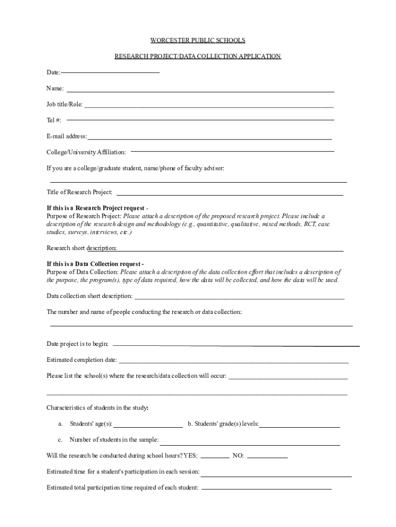 WORCESTER PUBLIC SCHOOLS RESEARCH PROJECT/DATA COLLECTION APPLICATION Date: Name: Job title/Role: ___ Tel #: Email address: College/University Affiliation: If you are a college/graduate student, name/phone