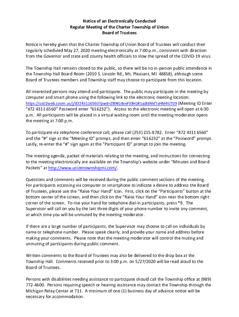 Notice of an Electronically Conducted Regular Meeting of the Charter Township of Union Board of Trustees Notice is hereby given that the Charter Township of Union Board of Trustees will conduct their