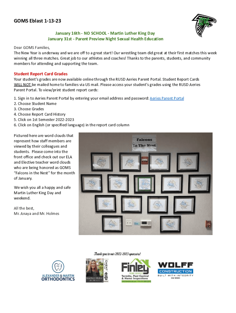 GOES Blast 11323 January 16th NO SCHOOL Martin Luther King Day January 31st Parent Preview Night Sexual Health Education Dear GOES Families, The New Year is underway, and we are off to a great start!