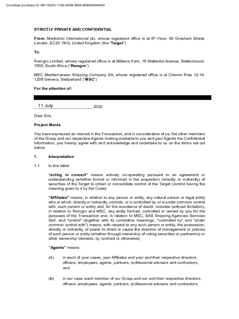 DocuSign Envelope ID: 94F7A20C175E49AB869480B5A6444650STRICTLY PRIVATE AND CONFIDENTIAL From: Medicine International plc, whose registered office is at 6th Floor, 65 Gresham Street, London, EC2V 7NQ,