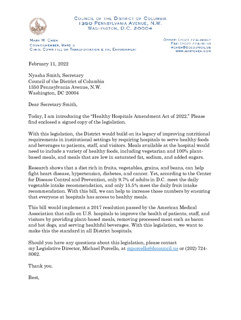 February 11, 2022, Nyasa Smith, Secretary Council of the District of Columbia 1350 Pennsylvania Avenue, N.W. Washington, DC 20004 Dear Secretary Smith, Today, I am introducing the Healthy Hospitals