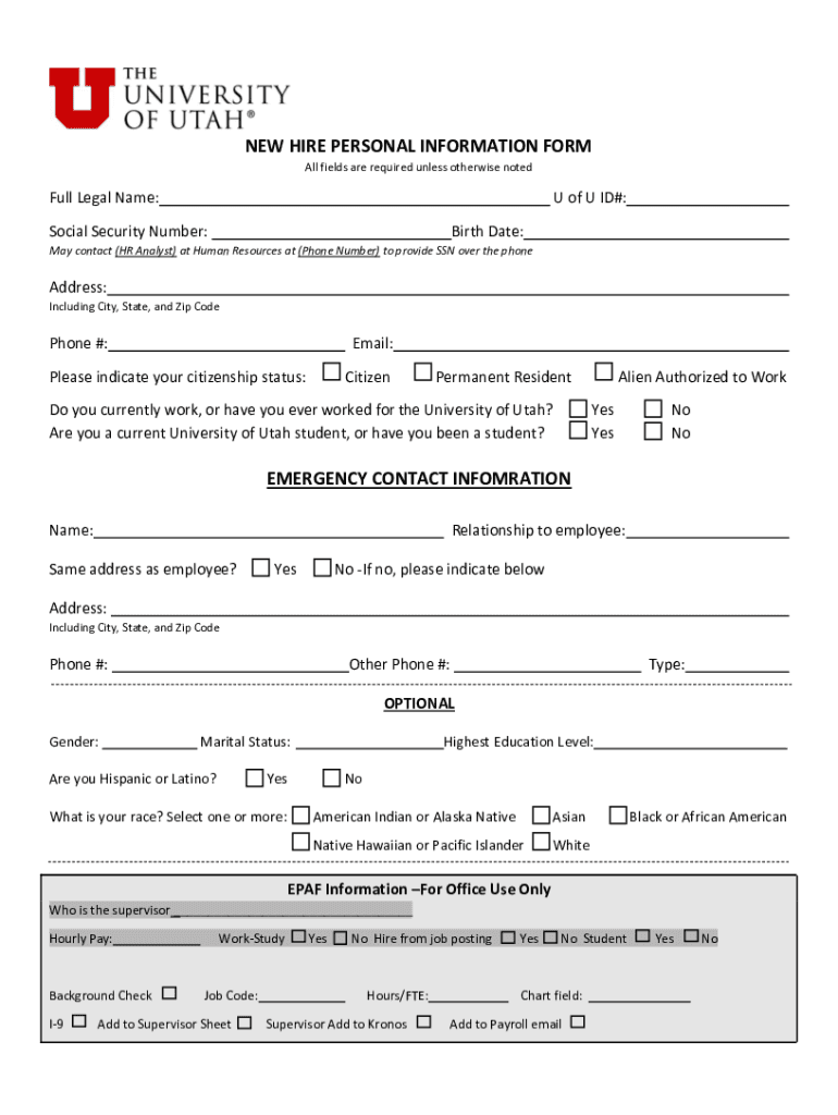 NEW HIRE PERSONAL INFORMATION FORM All fields are required unless otherwise needful Legal Name:U of U ID#:Social Security Number:Birth Date:May contact (HR Analyst) at Human Resources at (Phone Number)