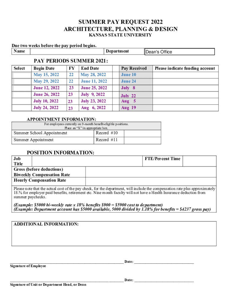 SUMMER PAY REQUEST 2022 ARCHITECTURE, PLANNING & DESIGN KANSAS STATE University two weeks before the pay period begins. NameDepartmentDean\'s OfficeMax PERIODS SUMMER 2021: Select Begin Date May 15,