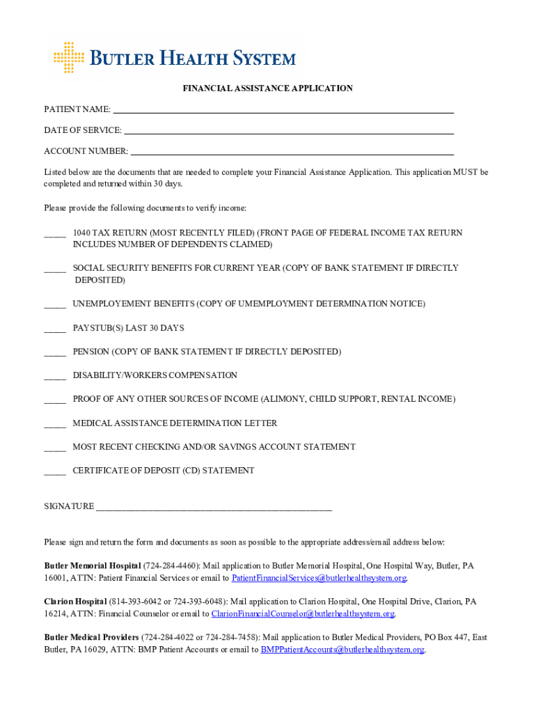 FINANCIAL ASSISTANCE APPLICATION PATIENT NAME: DATE OF SERVICE: ACCOUNT NUMBER: Listed below are the documents that are needed to complete your Financial Assistance Application. This application MUST