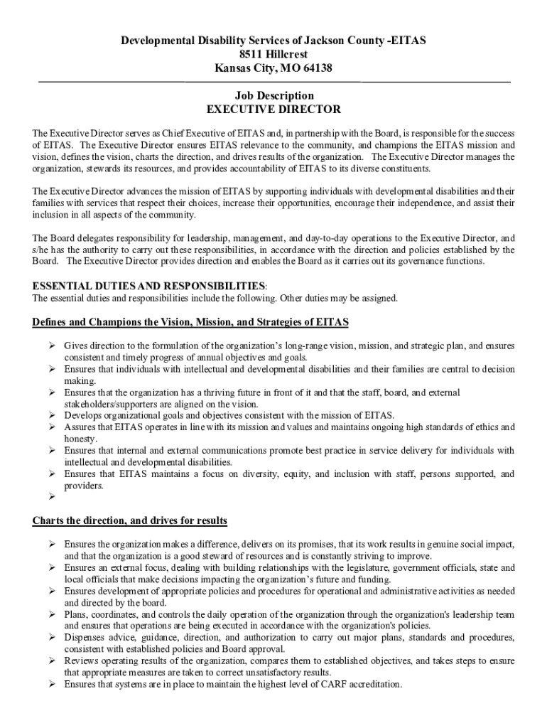Developmental Disability Services of Jackson County PITAS 8511 Hillcrest Kansas City, MO 64138 Job Description EXECUTIVE DIRECTOR The Executive Director serves as Chief Executive of PITAS and, in