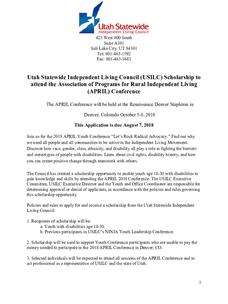 423 West 800 South Suite A101 Salt Lake City, UT 84101 Tel: 8014631592 Fax: 8014631683Utah Statewide Independent Living Council (USIC) Scholarship to attend the Association of Programs for Rural Independent