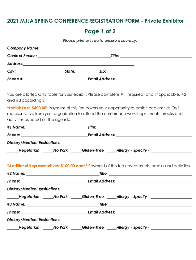 2021 MJ JA SPRING CONFERENCE REGISTRATION FORM Private Exhibitor Page 1 of 2 Please print or type to ensure accuracy. Company Name: Contact Person:Title:Address: City:State:Phone #:Zip: Email Address:You