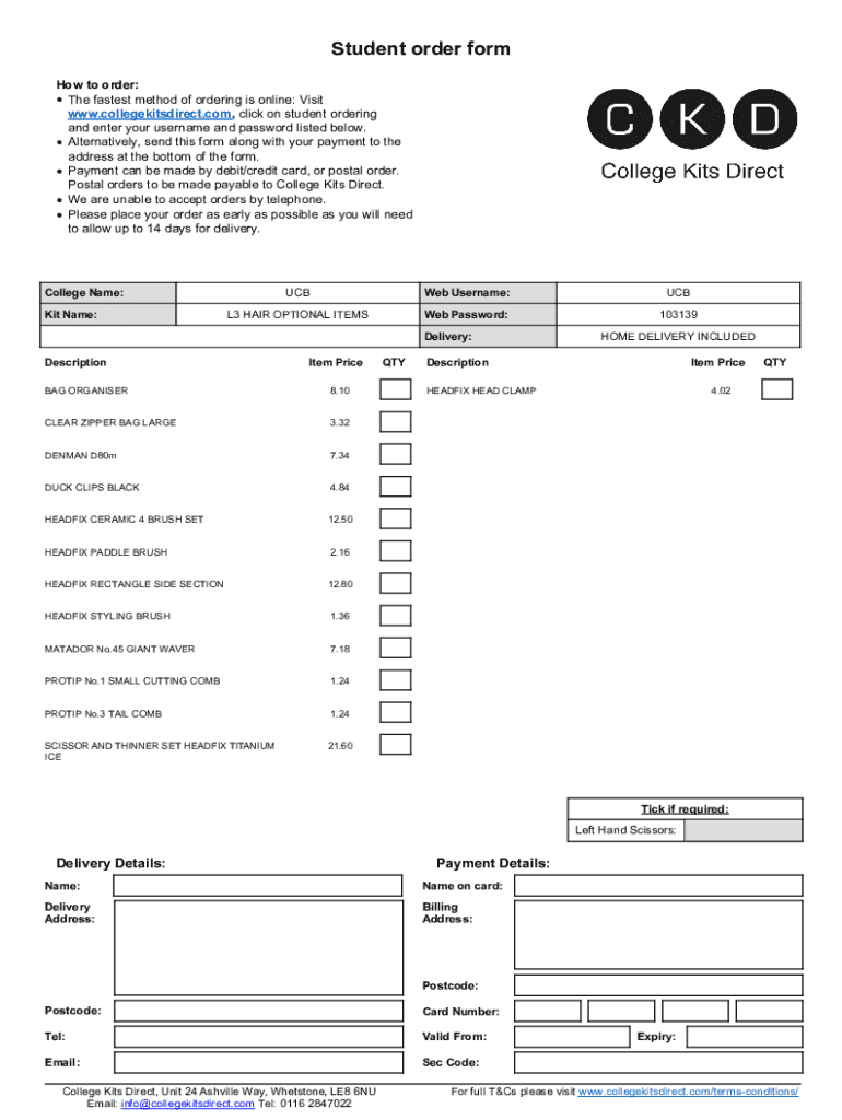 Student order form How to order: The fastest method of ordering is online: Visit www.collegekitsdirect.com, click on student ordering and enter your username and password listed below. Alternatively,