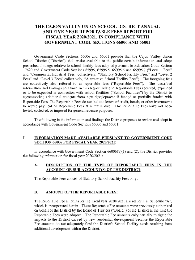THE CANON VALLEY UNION SCHOOL DISTRICT ANNUAL AND FOREBEAR REPORTABLE FEES REPORT FOR FISCAL YEAR 2020/2021, IN COMPLIANCE WITH GOVERNMENT CODE SECTIONS 66006 AND 66001 Government Code Sections 66006