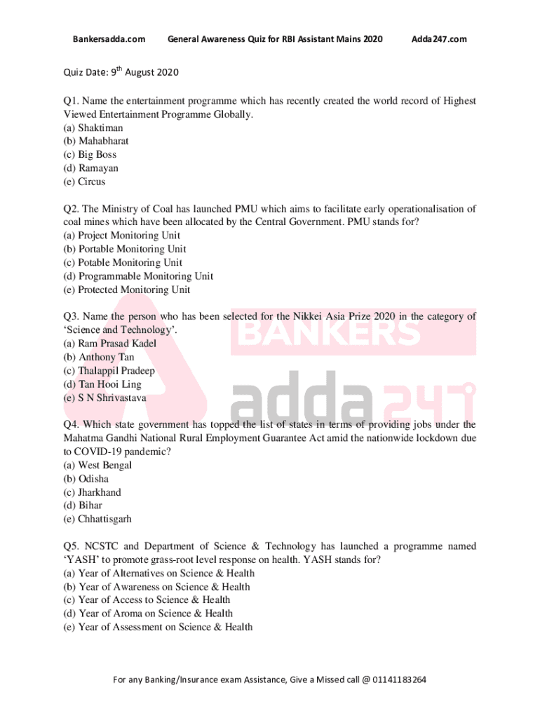Bankersadda.general Awareness Quiz for RBI Assistant Mains 2020Adda247.comic Date: 9th August 2020 Q1. Name the entertainment program which has recently created the world record of Highest Viewed