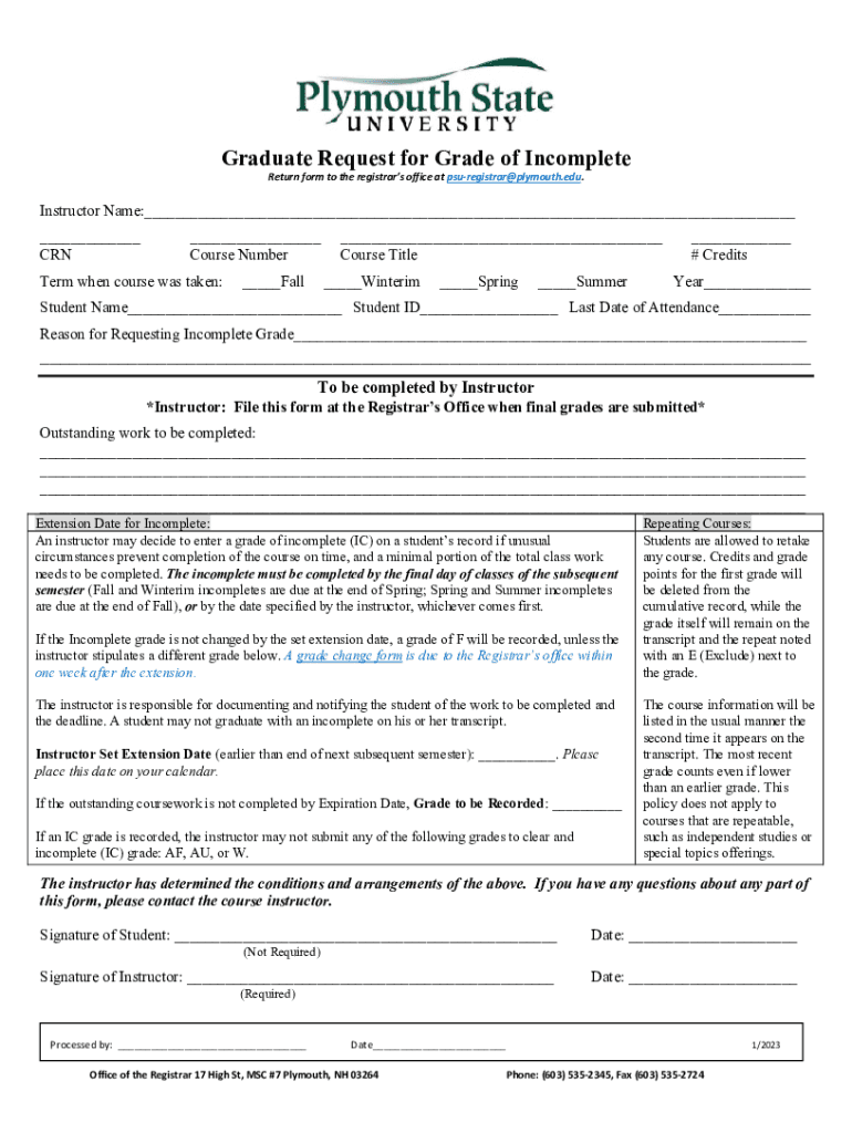 Graduate Request for Grade of Incomplete Return form to the registrars' office at psuregistrar@plymouth.edu. Instructor Name:___ ___ CRN___ Course Numbered when course was taken:___Fall___ Course