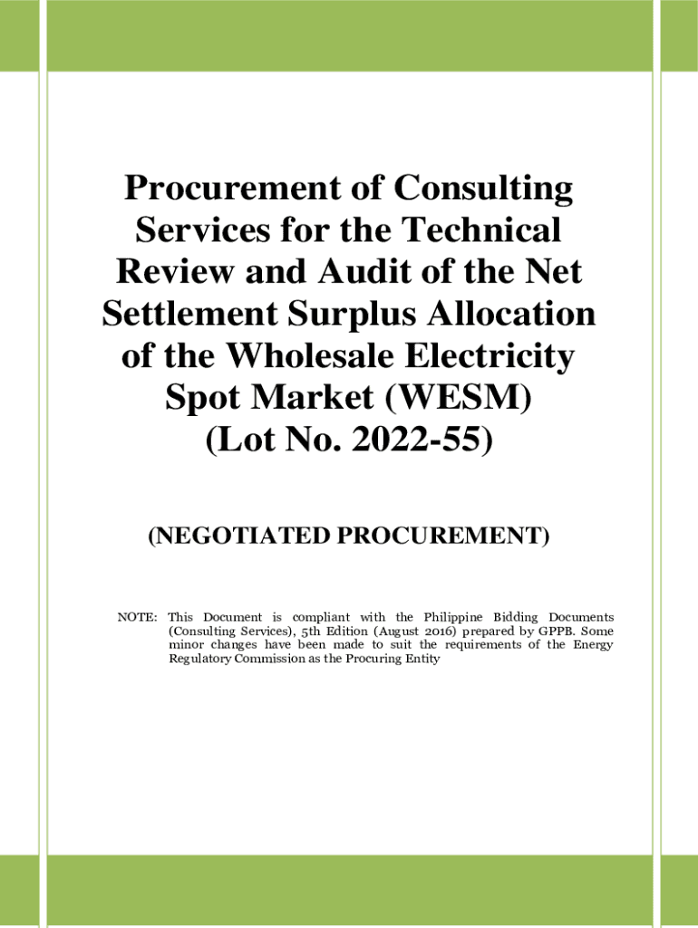 Procurement of Consulting Services for the Technical Review and Audit of the Net Settlement Surplus Allocation of the Wholesale Electricity Spot Market (WEST) (Lot No. 202255) (NEGOTIATED PROCUREMENT)NOTE: