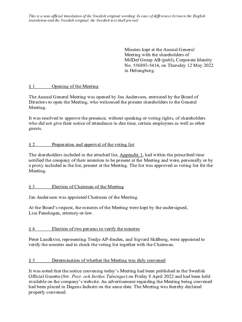 This is a nonofficial translation of the Swedish original wording. In case of differences between the English translation and the Swedish original, the Swedish text shall prevail. Minutes kept at