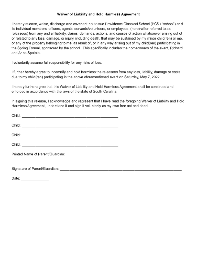 Waiver of Liability and Hold Harmless Agreement I hereby release, waive, discharge and covenant not to sue Providence Classical School (PCS / school) and its individual members, officers, agents,