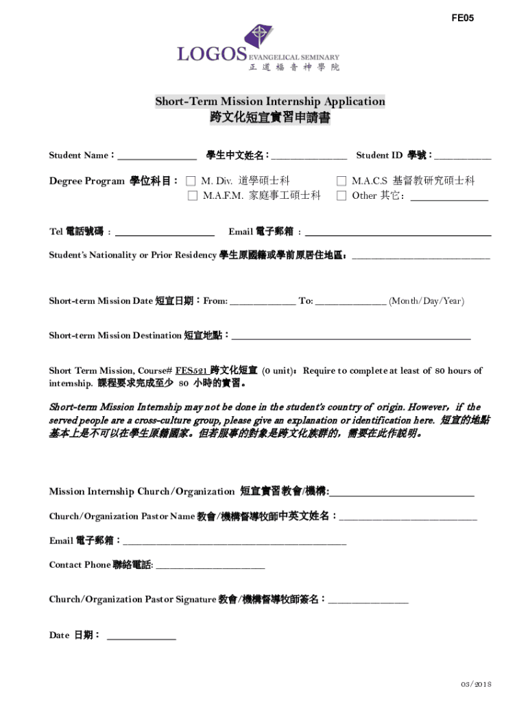 FE05ShortTerm Mission Internship Application Student Name___ Student ID ___Degree Program M. Div. M.A.F.M. Tel : M.A.C.S Other Email :Students Nationality or Prior to Residency ___Short term Mission