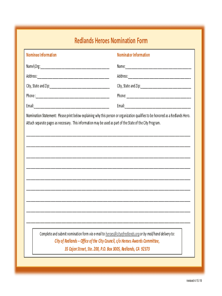 Redlands Heroes Nomination Form Nominee InformationNominator InformationNameOrg:___Name:___Address:___Address:___City, State and Zip:___City, State and Zip:___Phone :___Phone: ___Email:___Email:___Nomination